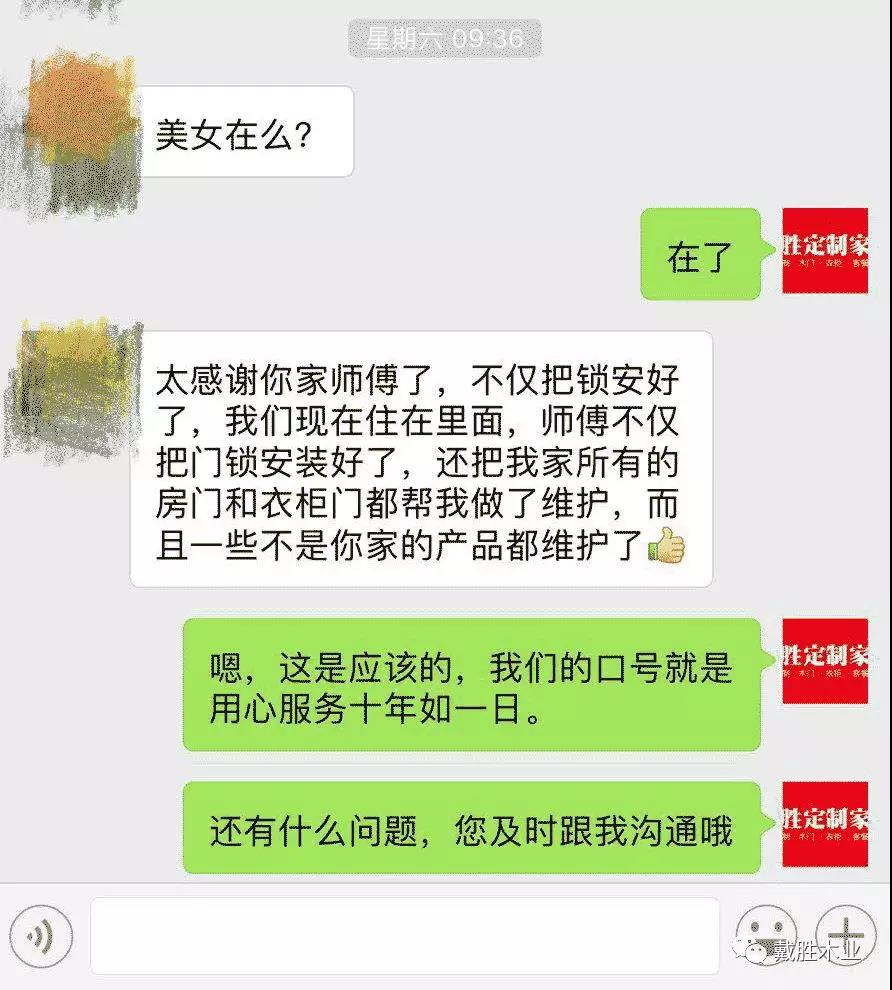 戴勝客服中心立刻安排“匠心服務(wù)團”為客戶(hù)解決難題,不僅如此,更幫客戶(hù)把家中所有木門(mén)、柜門(mén)都進(jìn)行了維護,得到客戶(hù)的高度評價(jià)。