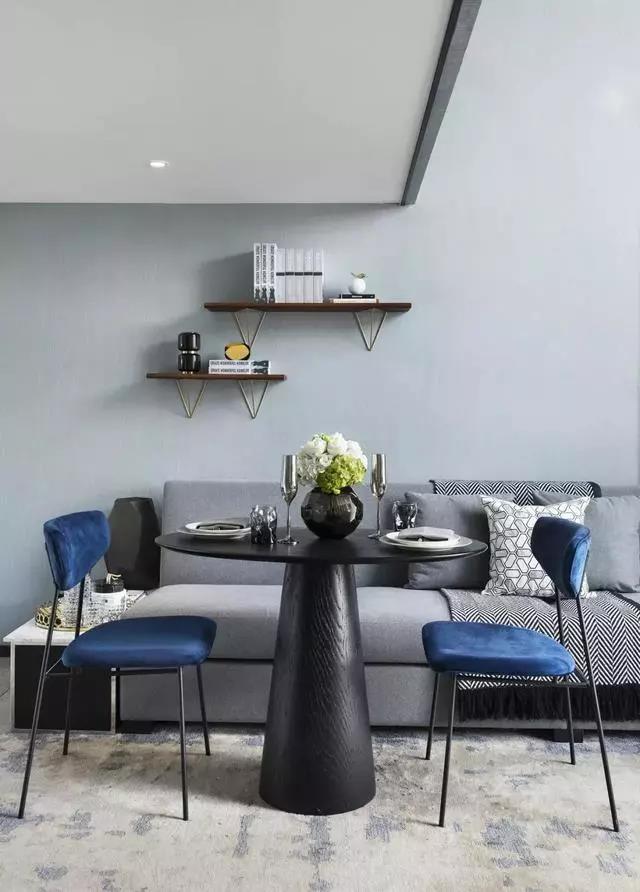 客餐廳拼合成一個(gè)大空間,兩層挑高的落地窗將陽(yáng)光引入,空間流動(dòng)著(zhù)靜謐和諧的氣韻。亮藍色與高級灰家具完美搭配,后現代主義抽象藝術(shù)品、幾何線(xiàn)條的不凡魅力充斥在空間中,呈現一種至臻完美的生活情景。